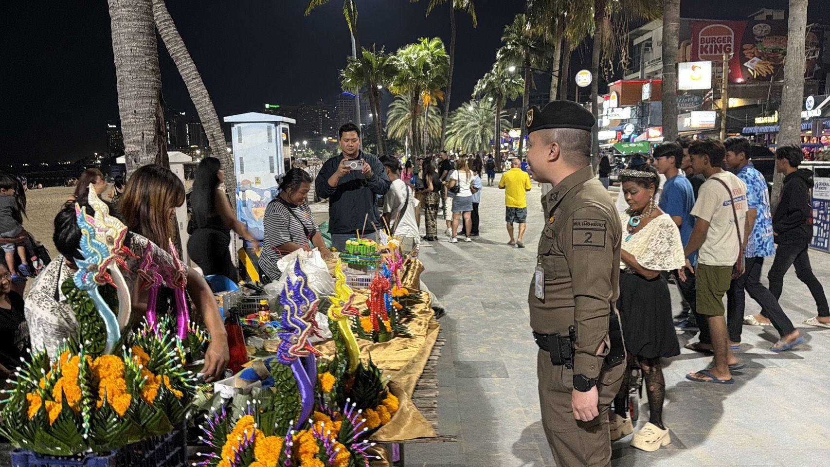 Crowds gathered at designated venues prepared by local authorities, primarily reservoirs, temples, and peripheral areas outside central Pattaya. Beachfront participation was noticeably lower than in previous years, following an official request from Pattaya City to refrain from floating krathong in the sea and instead use designated inland locations or temples. Beaches were also quieter due to lack of entertainment this year for the festival.